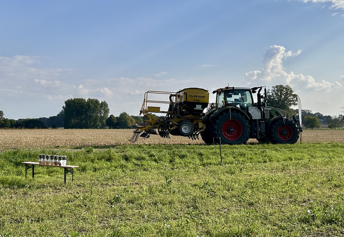 Die Claydon Drilltechnik ist neben weiteren Anbietern ein Beispiel für streifenweise Bodenbearbeitung und Saat. Auf dem Demonstrationsfeld wurde diese Drilltechnik mit einer herkömmlichen Saat mit verschiedenen Bodenbearbeitungsintensitäten verglichen. Der Flaschentest (vorne links im Bild) wurde herangezogen, um Unterschiede in der Bodenstruktur sichtbar zu machen.
