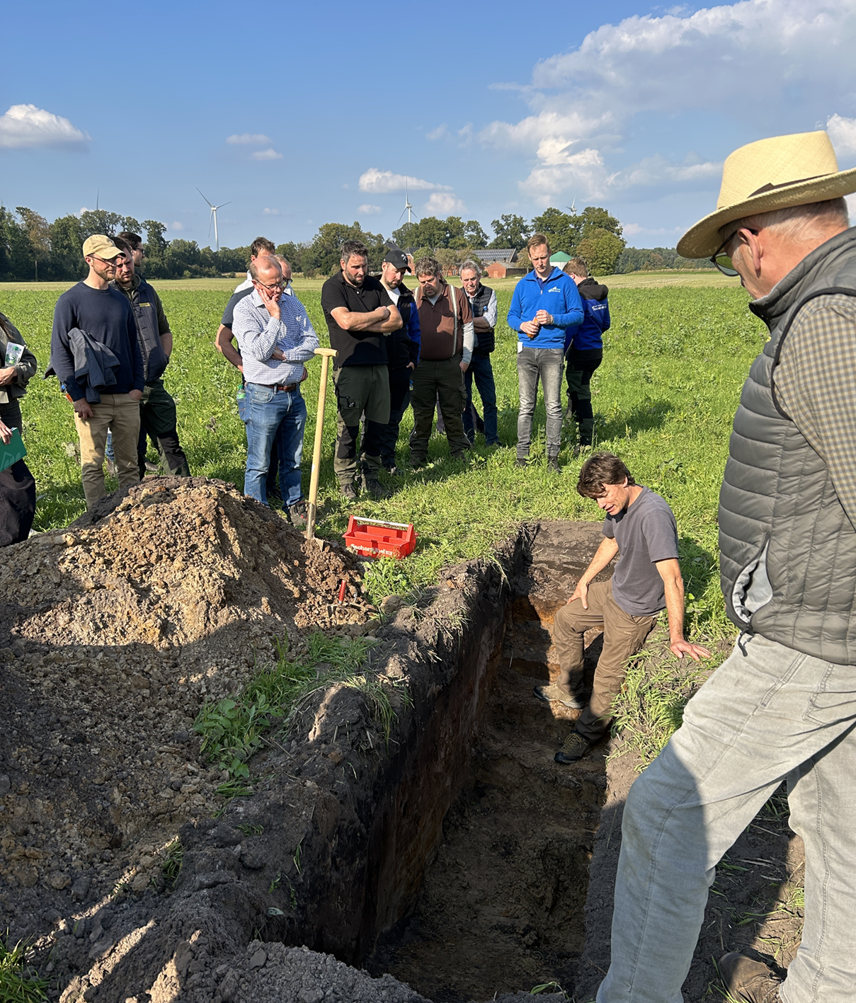 Im Bodenprofil diskutierte Dr. Konrad Egenolf (2.v.r.), LWK NRW, mit den Teilnehmenden den vorliegenden Standort und die Bodeneigenschaften.