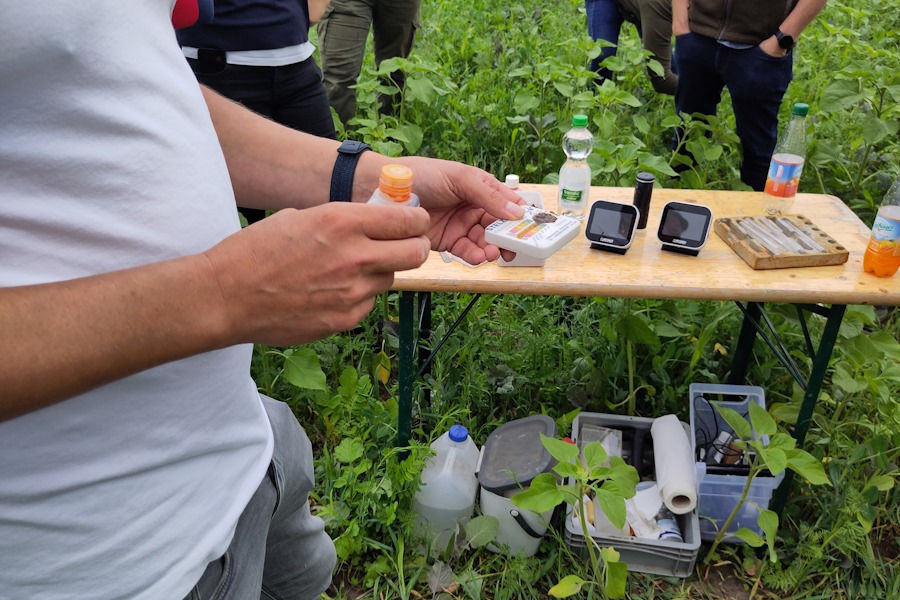 Mit einem Kohlenstoffdioxid-Messgerät untersuchte Schulz als nächstes den CO2-Austritt an der Bodenoberfläche aus dem Boden. Böden, die mit viel Organik belebt werden, atmen auch mehr. Schulz wies einmal mehr darauf hin, dass nicht die Quantität sondern die Qualität des Pflanzenmaterials entscheidend sei und Biodiversität auf dem Acker wichtig sei.