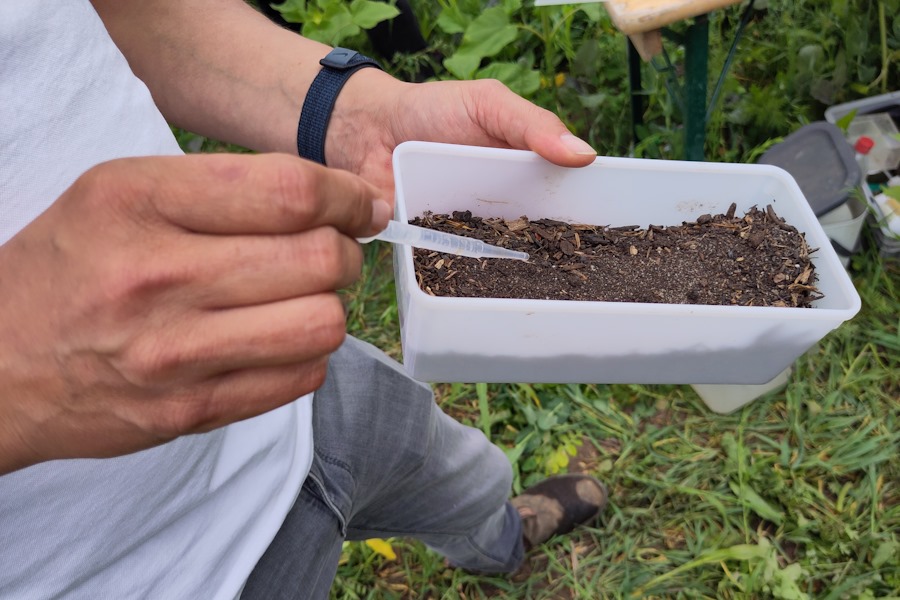 Darüber hinaus zeigte Schulz einige Methoden auf, die Landwirt:innen nutzen können, um eine erste Einschätzung der Bodenstruktur zu erhalten. Die Grundlage bildet die pH-Wert-Messung. Der pH-Wert sollte idealerweise in einer Spanne zwischen 5,8 und 6,9 liegen. Diese bietet beste Bedingungen für die Nährstoffverfügbarkeit und die Bodenfunktionen. Für die pH-Wert-Messung nutzte Schulz ein pH-Testkit, auf dem eine Bodenprobe mittels Indikatorlösung untersucht wurde. Auf einer Farbskala kann der pH-Wert abgeschätzt werden.