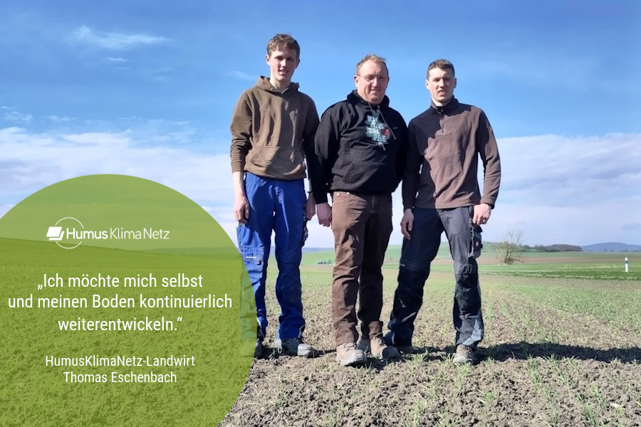 Humusaufbau bietet Thomas Eschenbach die Möglichkeit, CO₂ zu speichern, das Bodenleben zu fördern und gleichzeitig die Erträge zu steigern. Im Jahr 2019 hat Eschenbach einen Bodenkurs zur regenerativen Landwirtschaft besucht – seitdem ist ihm bewusst geworden, „dass regenerative Landwirtschaft nicht einfach umzusetzen ist, wenn man wirtschaftlich davon leben muss. Deshalb erhoffe ich mir viel von der wissenschaftlichen Begleitung im Projekt.“